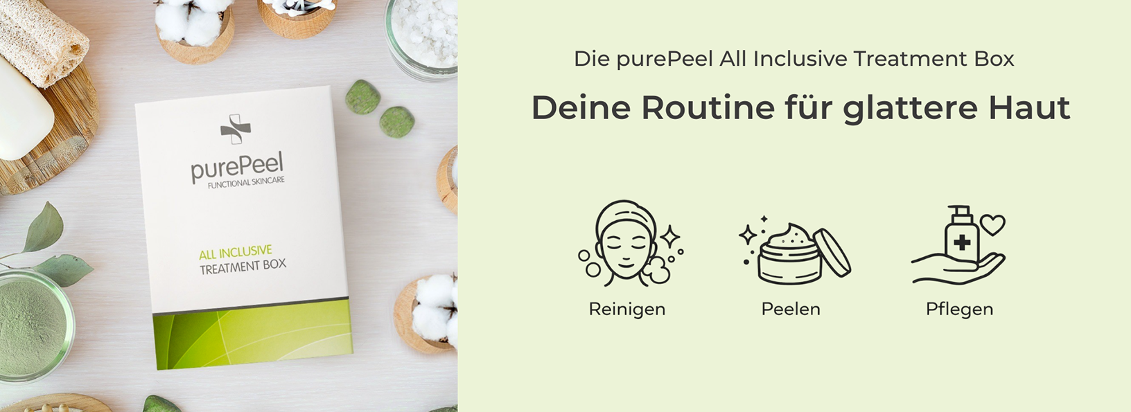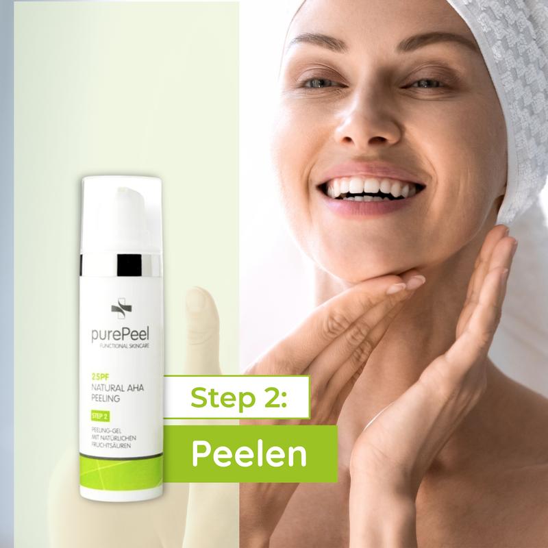 Empfindliche Haut sollte sich langsam an Fruchtsäuren gewöhnen. Deshalb beginnt die Anwendung im Set zunächst mit der 15pf Peeling Mask, die als Einstieg dient. Sie hilft der Haut, sich schrittweise an die Fruchtsäure zu gewöhnen, bevor später auf das purePeel 25pf gewechselt wird.
